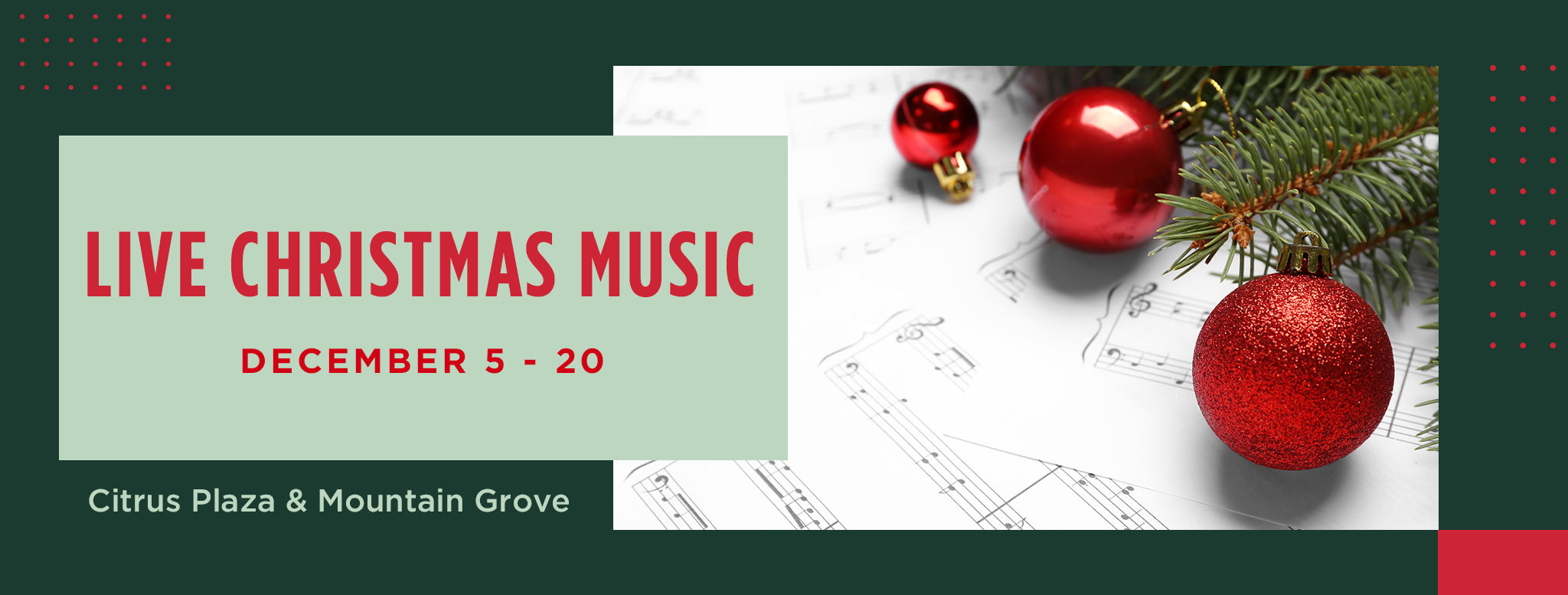Celebrate the season with festive live music throughout December at Mountain Grove and Citrus Plaza. Enjoy cheerful holiday performances in cozy settings across the centers, creating the perfect soundtrack for shopping, strolling, and soaking in the spirit of the season.