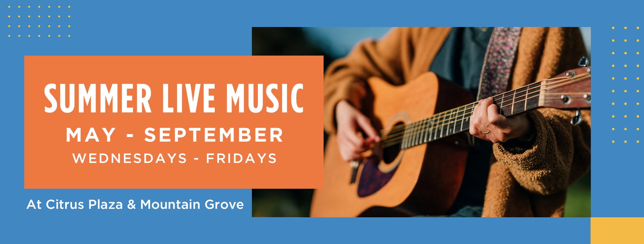 Make the most of summer evenings with live music at Mountain Grove and Citrus Plaza! This multi-week series features rotating performers and a relaxed outdoor atmosphere—perfect for dining, strolling, and unwinding. Join us throughout the season for great tunes, good vibes, and warm summer nights.