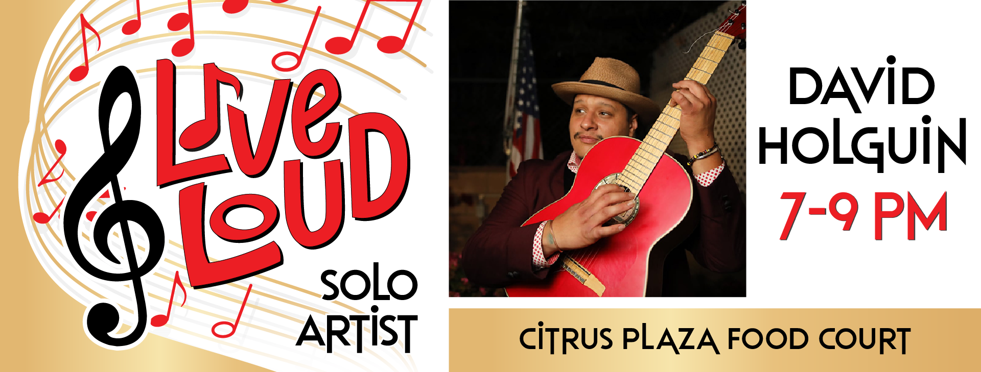 Come enjoy a great evening on Friday, May 8, 2026 at Citrus Plaza - Food Court from 7 PM - 9 PM with David Holguin. Grab a bite, settle in, and enjoy the show.